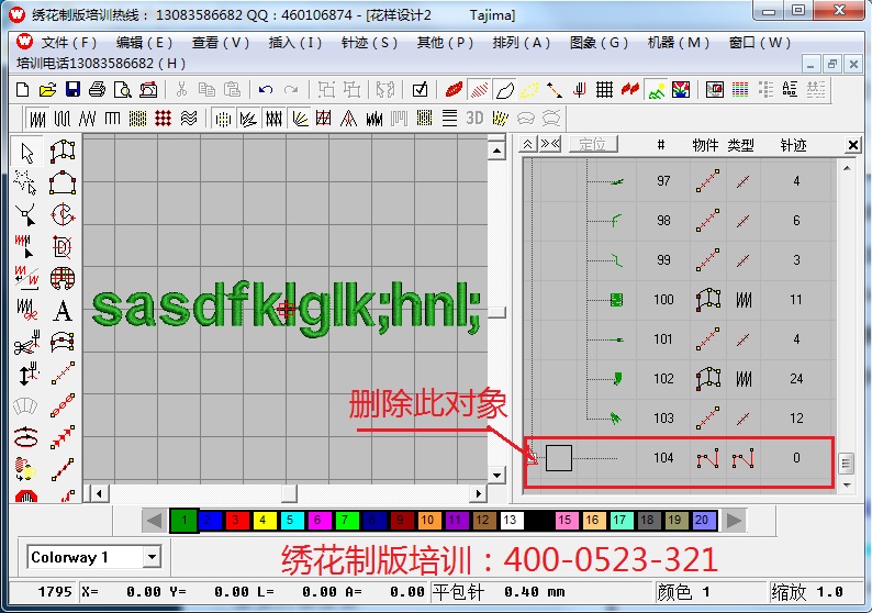 在生产实践中我们经常拿到客户的外来版,对于客户的外来大部分情况下是要修改的,但是修改外来版不是一件轻松事,因为外来版中没有绣花打版软件的打版信息。也许你要问,我们打开外来版时不是有轮廓线啊?是的,我们打开一个外来版是可以看到有轮廓线,但是这些轮廓线是绣花制版软件自动加上去的,它实际上是不准确的,绣花制版软件自动加上去的轮廓线是不准确的,因为它是一种估算值,对于精细小字母来说,不懂改版的人用整形命令可能会把版子改坏。修改过的外来版有可能能需要重新设置起针点,但是老起针点必须删除,否则就会出现不必要的空跳针,删除老起针点的方法很简单,只要打开颜色物件清单(对象清单),选择第一个0针对象和最后一个0针对象删除一下就行了如图1和如图2.。